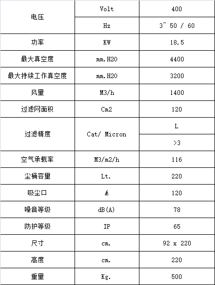 聚酯纖維過(guò)濾網(wǎng)安裝和保護(hù)在鋼鐵過(guò)濾桶里,星型濾袋可使過(guò)濾網(wǎng)面積達(dá)120000 cm2并且具有高過(guò)濾功效(3微米)。安裝有空壓機(jī)的自動(dòng)清潔震塵系統(tǒng)可通過(guò)垂直振塵運(yùn)動(dòng)高效持續(xù)地清潔過(guò)濾網(wǎng)(頻率及長(zhǎng)度可設(shè)置調(diào)整),最終讓大部分灰塵掉落保持過(guò)濾網(wǎng)干凈,這樣能夠延長(zhǎng)它的使用壽命和確保吸塵功效。前部鋁質(zhì)以印模壓鑄的吸塵接口(直徑120毫米)放置在過(guò)濾網(wǎng)下方,因此不用取出或更換過(guò)濾網(wǎng)就可以同時(shí)灰塵和固體等物質(zhì)。過(guò)濾筒內(nèi)一個(gè)旋風(fēng)分離器直接將絕大部分的灰塵直送入集塵桶,能保護(hù)過(guò)濾網(wǎng)不被割破或撕開(kāi)。