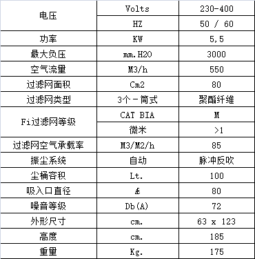 3個聚酯纖維筒式過濾網裝在鋼制過濾艙中,總過濾面積80000 cm2,過濾精度 高達1微米 。全自動空氣脈沖反吹清潔系統通過壓縮空氣輪流吹向筒式濾網,清潔頻率可通過控制面板上的定時器進行設置,能持續有效地清潔過濾網,清除附著在濾網上的大部分灰塵,從而保持機器正常的吸塵功效和延長濾網使用壽命。模壓鋁制吸塵口直徑為Ø80 mm,位于過濾網下面,能夠同時吸塵、吸固體和吸水(水量不得超過塵桶容量),無需更換或取出過濾網。  壓縮機需另配。