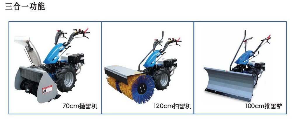 7.通用性,機器可以一機多用,即:一臺主機可以更換掃雪滾刷、除草、旋耕、開溝、雪鏟、拋雪等數十種以上的輔具頭。